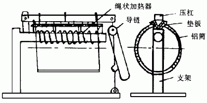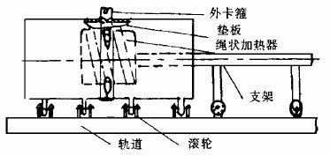 图2 组装纵缝工装图 (5)焊纵缝时,为防止出现棱角变形,采用两根角钢作压杠压在焊缝两侧,用导链拉紧(图2),此法还可消除错边。焊环缝时,既要防止出现棱角变形,又要防止筒体弯曲变形,尤其是当许多节筒体组焊在一起以后,烟囱自重引起的弯曲更不可忽视。我们的办法是:①增加环形垫板厚度和支撑力来防止棱角变形;②采用对称均匀分布的多支点滚轮架来防止筒体弯曲变形(图3),图中只画出两节筒体对接的情况,实际生产时在平直轨道上装有许多对滚轮,这批滚轮都要经过校正校平,使它们排列在两条平行直线上。多节铝筒对接时,加热装置逐节后退,筒体逐节延长。
