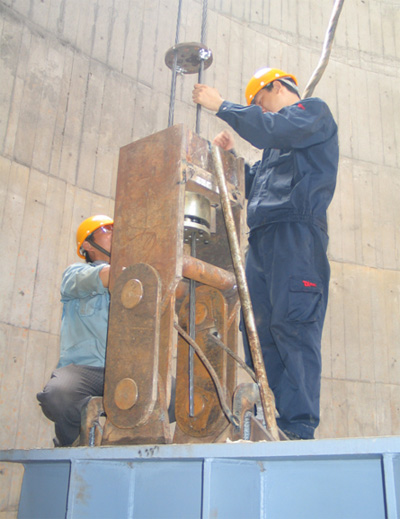 用垂直电梯(2T)及5T卷扬机将吊装顶层平台用两台250T液压千斤顶及配套设备等运到提升系统平台上。设备就位前将辐射梁与烟囱外筒顶部预埋铁件及钢筋焊接将其固定.