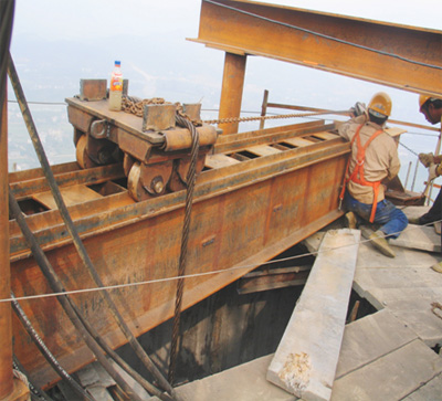 等下吊点固定好后,上吊点钢铰线逐根紧固。第二跟主梁吊装时,把第一次吊装用钢铰线的下部变为第二次吊装上部钢铰线,不仅减少穿钢铰线带来的高空作业,且节约工了期。
