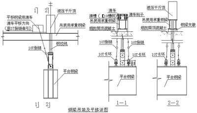 用原烟囱外筒施工提升系统平台上部的2T卷扬机将烟囱顶部吊装用两根承重辅助梁及其它材料运输到位,在提升系统平台上加工临时吊装平台及两根承重辅助梁(加工临时平台材料主要用下面三层平台止晃点处暂不使用的400*400H型钢梁,承重梁材料用钢内筒烟道口导流板处的I56a工字钢);2T卷扬机钢丝绳用Φ14(6*37+1)钢丝绳,上料过程中所有导向滑轮不得低于2T,导向滑轮用钢丝绳头为Φ16(6*37+1)钢丝绳。