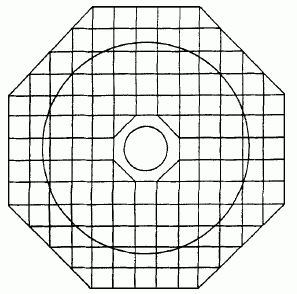 图1 水塔立面图 后,再紧固定型模。并在每节外模设5道Φ10 mm钢筋箍锁紧外模,再与钢管架体适当拉接。上一节定型模在第一节支筒砼浇灌24 h后即可安装。上一节木模底端与第一节木模顶端采用螺栓连接,以保证定位准确。第一节支筒木模在上一节支筒砼浇灌36 h后,即可拆卸,经整理,继续上节支筒施工。 3•2 水箱模板的支撑与制安 高空水箱模板支撑是在经固化处理的地面上(范围大于水箱直径1•6 m),搭设立杆间距1•20 m×1•20 m的八角型钢管架体支撑(图2)。在倒锥水箱底模处,按倒锥倾角和高度,调整各立杆高度,使立杆顶在水箱底模主木骨料上(图3)。地面固化处理强度及钢管架支撑体系,需经荷载、刚度、稳定性等计算,确保安全可靠。