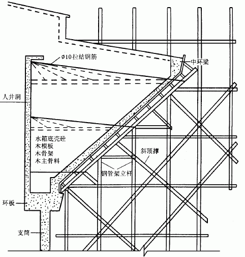 图2 钢管架支撑体系 钢管架设3道,每道4根Φ14 mm钢丝缆风绳。锁定每道缆风绳时,应测量、校正钢管架垂直度,以保证水箱支模稳定、牢靠,不产生偏移。利用先浇筑的钢筋砼入井筒,在水箱中部与上口处设2道水平Φ10 mm对称辐射拉结钢筋,锁住水箱木骨架,并以法兰螺栓调整水箱几何尺寸,钉上木模板,完成水箱底壳木模制安。水箱上壳支模在水箱底壳砼强度达70%后进行。支撑在底壳处均要铺厚60 mm、宽150 mm木脚手板,以固定支撑,减缓对底壳砼的集中压力。 3•3 钢筋制作与安装 支筒钢筋预埋位置在桩承台面层钢筋上划定后,用一根Φ12 mm钢筋制成圆环箍,与承台面层钢筋焊牢,划分支筒各钢筋准确位置,将支筒预埋钢筋与承台钢筋、Φ12 mm圆环钢筋点焊固定。确保支筒主筋间距误差≤10 mm,保护层厚度误差≤5mm。支筒箍筋与主筋全面绑扎固定,并沿高度每米一道采用螺纹Φ12 mm圆环加劲箍筋与支筒主筋点焊,防止支筒主筋扭转、几何尺寸和垂直度偏差。支筒主筋在门、窗洞口断开处,严格做好与加固钢筋焊接。并保持开口处上方主筋的定位、间距准确。环板、水箱钢筋严格按图尺寸预制,在木模上等分定位安装。检查无误后,再与箍筋或分布筋绑扎固定。按各保护层厚度,设置砼保护层垫块,严防施工中踩踏水箱钢筋。 支筒中做防雷引下线钢筋,认真做好标记和焊接。水箱则另设4根Φ12 mm钢筋,与水箱顶盖和支筒主筋焊接,以满足防雷技术要求。 3•4 支筒及水箱底壳砼施工 支筒与水箱砼拌制根据试验配合比,按现场砂、石含水量调整后,严格控制水灰比。支筒砼坍落度控制为40 mm,水箱底壳因与水平面呈45°坡度,故砼坍落度严格控制在30 mm。支筒砼运至施工平台后,用人工沿圆周均匀铲入模内。每次进入模高度控制在300 mm,振动器振捣从4个方向对称振捣,以避免木模产生偏移。水箱底壳砼沿周圈逐步向上铲入,每次入模沿锥面高度约500 mm。在砼初凝前,用平板振动器由下往上拉动振实,并由人工及时修平,补实砼面。水箱底壳砼一次性连续浇灌至中环梁顶端水平施工缝处,以加强水箱抗渗漏能力。 4 施工中测量与控制技术 桩基完成后,桩承台施工时,认真做好支筒中点及4个方向的定位、复核。并将轴线延伸至支筒外,以便于经纬仪测量。同时在砼承台面划出支简内、外侧模板边线。由于钢管架及密目安全网遮挡,支简木模安装时,其中心点定位、校核及垂直度测定,先用经纬仪在4个方向投影至相应平面的钢管架上,再拉尼龙线,形成十字交叉点,确定中点。然后用线垂直逐层复核,以控制支筒木模中点准确,并校核圆弧度及垂直度。如有偏差,及时纠正。支筒高度升至15、25、35 m时,对支筒、钢管架沉降量和垂直度进行监测,藉以预防、控制产生偏差。水箱底座及中环梁中点确定后,用水平仪在钢管架上测出水箱中环梁顶面水平高度。并做好水箱底壳锥体坡度等几何尺寸核样工作。按设计要求,水箱试水沉降观测每进水50 m3观测一次,并及时记录沉降值。