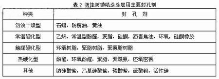 喷涂后应尽快封孔。喷涂涂层存在微细气孔,喷涂后暴露在潮湿环境中,气孔内部会迅速结露。封孔阻止气体侵入涂层内部,而且降低气体的侵入效果。表2是目前使用的防蚀防锈封孔剂种类。