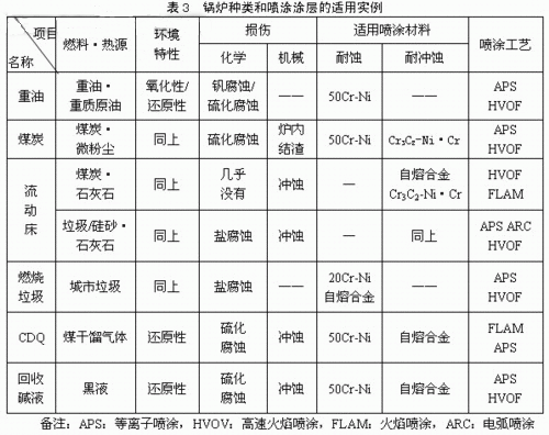 表3是锅炉种类和喷涂涂层的适用实例。锅炉有产生高温高压水蒸气的过热气管、再热器管、承受最高温度到接触燃烧燃料的水冷壁管等。前者管壁温度高,附着的燃料灰呈熔融状,后者受燃烧火焰的影响受到强烈的热辐射,处于氧化性或还原性气氛中,容易腐蚀。