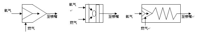 从示意图不难看出,第一种结构简单,可以在较低的燃气压力下工作,这对于那些还在使用乙炔发生器的用户是有利的,但因没有专门的混气结构,因而燃烧效率不高;第二种结构必须使用较高的燃气压力,这对于已经普遍采用瓶装燃气的今天是没有什么困难的,环形的混气结构提高了燃烧效率,但因对气流的阻力较大,因而气体流量的增加受到限制,故功率的增加很有限;第三种结构除采用射吸式进气外,螺旋式的混气通道,既增加了混气路线的长度,又没有增加流体阻力,因而燃烧效率和功率都能同时得到提高,这就是CP型高能喷枪能较容易的实现氧化锆等高熔点材料喷涂的关键所在。