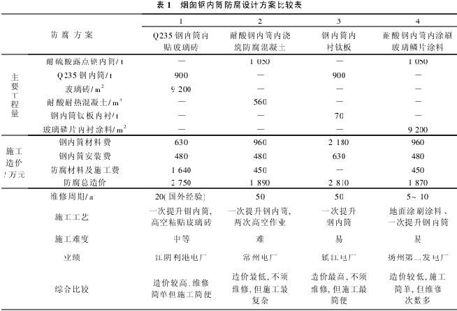 (1)国内北仑港电厂1号、2号(600MW)机组在未进行脱硫工艺中,烟囱钢内筒防腐层采用耐酸耐热混凝土,而常州电厂2×600MW一期工程烟囱钢内筒防腐设计方案在采用脱硫工艺后,比排放普通未脱硫烟气的烟囱对防腐蚀设计要求要高得多,烟囱内壁的防腐蚀措施应进一步加强. (2)C型816耐酸耐热混凝土在原有B型816耐酸胶泥取得使用经验后,开发的新型防腐材料.C型816耐酸耐热混凝土是密实型钠水玻璃类防腐材料,这类材料具有极优良的耐酸性能,可以耐除氢氟酸以外的绝大多数有机酸和无机酸,能耐高浓度的氧化性酸.同时还具有很高的耐热性,使用温度可达300℃. (3)硅酸凝胶(Si(OH)4),这种具有胶体性质的硅酸凝胶将耐酸粉料、骨料粘结成一个整体,导致混凝土的固化.耐酸粉料是由原生矿料经1 200~1 300℃高温煅烧,磨细而成.粉煤灰类选自电厂锅炉燃烧后产生的Ⅰ级粉煤灰,其主要成份有玻璃微珠.C型816耐酸耐热混凝土经国电电力建设研究所试验,完全符合电力行业标准《火力发电厂烟囱(烟道)内衬防腐材料》(DL/T901-2004)的技术要求. 3 常州电厂2×600MW一期工程烟囱钢内筒防腐施工方案 常州电厂2×600MW一期工程烟囱钢内筒防腐施工前,对施工方案的选择也作了一些技术经济上的比较,详见表2.最终确定施工方案如下:在烟囱钢内筒施工全部结束后,在烟囱226 m平台向上搭设一座钢结构框架,此框架作为今后钢内筒内操作平台和吊笼吊提升系统的承重结构.每只钢内筒施工时,筒内布置一只由电动卷扬机牵引的运输吊笼,布置一座通过手板葫芦提升的操作平台,通过操作平台向上爬升,吊笼不断上下运动完成耐酸耐热混凝土施工.