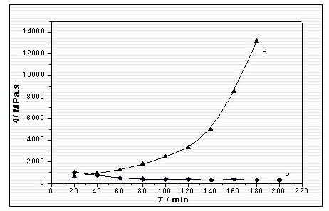 如图2所示,两个体系采用相同的乳液和不同的固化剂,研究发现曲线a的粘度随着搁置时间的延长而逐步提高,是I型水性环氧树脂体系,而曲线b所代表的体系则属于II型水性环氧树脂体系。对于II型水性环氧树脂体系粘度呈下降趋势的现象可作以下的分析:因为II型水性环氧树脂体系所用的环氧-多胺固化剂是水溶性的,当两个组分混合后,环氧树脂以微粒形式分散在环氧固化剂水溶液中,该体系的粘度主要由水相的粘度决定。随着搁置时间的延长,水性环氧固化剂分子从水相不断向环氧树脂微粒表面及其内部扩散,致使水相中的固化剂浓度不断下降,宏观上就表现为体系的粘度不断降低[20]。当环氧树脂微粒表面的表观粘度增大到一定程度时,固化剂分子向其内部的扩散速度有所减慢,体系的粘度也就基本保持不变。因此,用体系粘度随搁置时间的变化来确定水性环氧树脂体系的适用期是不可靠的,而应选择别的特征参数,如涂膜光泽度、玻璃化温度[21]等等。