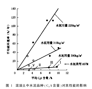 水泥用量增加可提高混凝土密实度,从而可以提高混凝土的抗硫酸盐性能。G.J.Verbeck对加利福尼亚州萨拉曼都硫酸盐土壤(含10% %Na2SO4)中的混凝土试件进行长期研究,其结果见图1。
