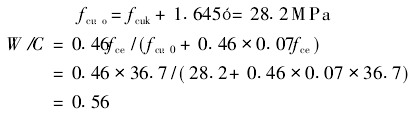 从图1可见,当水泥用量为225kg/m3和310kg/m3时,硫酸盐溶液对混凝土的破坏程度随着C3A的增加而增大,但当水泥用量达390kg/m3时,硫酸盐溶液对混凝土的破坏随着C3A含量的增加而只有稍微增加。ASTM标准的5种水泥中除早强型水泥外,Ⅰ、Ⅱ、Ⅲ和Ⅴ型水泥(水泥中C3A含量分别为10%、4%、8%和3%)混凝土的破坏几乎为零。这说明高水泥用量会显著地增强混凝土的抗渗性,进而提高混凝土的抗侵蚀能力。防腐混凝土使用的水泥除物理性能满足标准要求外,其C3A含量不超过8%,同时为防止碱集料反应,应尽量采用低碱水泥,我们选用了“科华”牌P.O32.5水泥。 2.2 粉煤灰 在本项的混凝土施工过程中,掺入一定量的粉煤灰,这样可改善混凝土的抗腐蚀性能,因为首先用火山灰质混合材将降低水泥中的C3A和C3S的含量,相当于在混凝土中所用的胶结材料是低C3A和低C3S的水泥。其次这些火山灰质混合材的水泥水化过程中产生Ca(OH)2,引起化学反应生成C-S-H凝胶,除了消除一部分Ca(OH)2外,还能提高强度。Ca(OH)2的消除将减轻其膨胀危害,强度的提高则能限制其膨胀。C-S-H凝胶的产生使结构致密,降低了SO42-渗透进混凝土的能力。所以我们选用了江西贵溪电厂Ⅱ级粉煤灰。 2.3 砂 为降低混凝土中的Cl-含量,我们选用了级配良好、含泥量等符合标准的中砂。 2.4 卵石 通常,天然砾石呈圆形,具有光滑的表面结构;破碎的岩石表面具有粗糙结构,粗糙度取决于岩石类型及所选择的破碎设备。破碎的骨料可以含有相当数量的扁平和长条颗粒,这类颗粒对混凝土许多性质起不良影响。呈高度蜂窝状的浮石轻骨料同样呈多角形和粗糙结构,但陶粒或页岩轻骨料通常呈圆形和光滑结构。为提高混凝土密实度,我们选用0.5~4.0cm连续级配卵石配制防腐混凝土。 2.5 防腐剂 为了抑制混凝土的侵蚀,并对市场上的调查,我们选定了NF-C耐腐蚀防水剂,此剂具有一定的引气和减水功能,降低了混凝土的用水量,在混凝土中形成大量的密闭、均匀的微气孔,改善了混凝土的孔结构,提高了混凝土的密实度。 3 防腐混凝土配合比设计 根据设计说明及现场取样的水质分析报告来确定混凝土配合比设计的防腐等级,高水泥用量低渗透性的混凝土具有较高的抗硫酸性能,因此在混凝土施工过程中应尽量提高其抗渗性。除了增加水泥用量外,另外一个重要措施就是降低水灰比,一般情况水灰比低则混凝土致密,抗渗性也相应地提高。 3.1 按试配强度计算水灰比