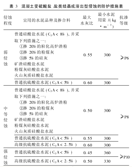 按《公路混凝土与砌体工程施工规范》(TB10210-2001/J118-2001)中表C.0.2环境水对混凝土侵蚀类型及侵蚀程度的判断的判定规则(见表2),永坎铜矿改线工程的地表水水质属中等侵蚀,所以根据表C.0.3混凝土受硫酸盐、盐类结晶或溶出型侵蚀的防护措施的规定(见表3),其最大水灰比应小于0.50,要求抗渗等级≥P8。