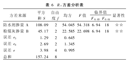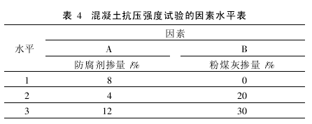 3.2 计算水泥用量、粉煤灰用量 根据防腐混凝土施工工艺要求确定坍落度为30~50mm。通过混凝土拌合物性能试验选择用水量171kg/m3。粉煤灰采用外加法,掺入量为水泥用量的30%。 水泥用量CO=171/0.43=398kg。 粉煤灰用量Fm=C0×30%=398×30%=119kg。 3.3 计算砂石用量 按假定容量法2400kg/m3计算,砂率取38.0%。 砂用量Sm=558kg,石用量G0=1136k 3.4 计算外加剂用量 按计算的水泥用量C0计算外加剂用量,按8%最佳掺量掺入。 3.5 根据实测容重调整混凝土的原材料用量 4 正交试验设计 4.1&nb sp;选择因素水平 因素水平详见表4。 由极差大小可知:NF-C耐腐蚀防水剂对混凝土抗压强度的影响最大,粉煤灰对混凝土抗压强度的影响次之。计算表明,A因素和B因素三个水平测值的和,均以第一水平为最大,即粉煤灰掺量越小,NF-C耐腐蚀防水剂掺量最佳时,混凝土抗压强度越大。