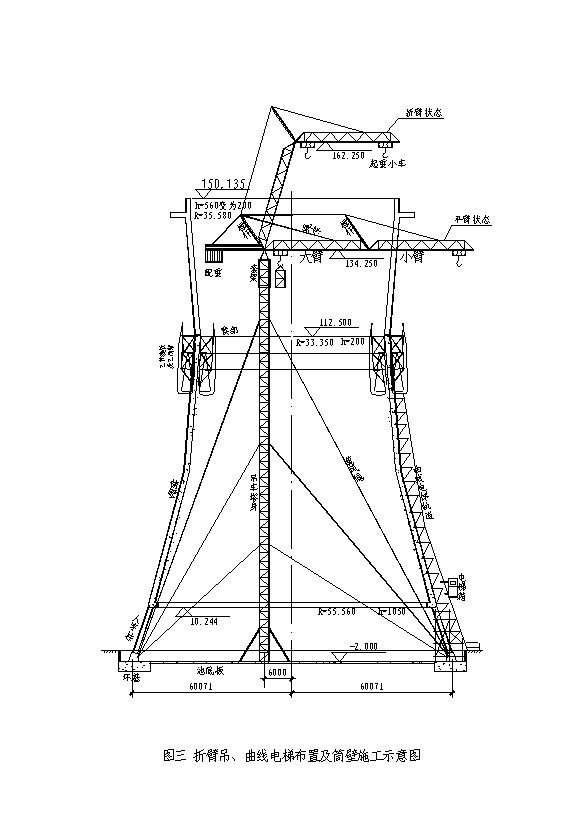 筒壁施工吊车、曲线电梯布置及筒壁施工示意图见附图三。