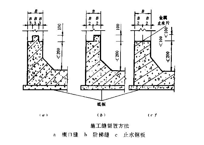 由于施工缝位于施工接茬处,如处理不好就很容易产生渗漏水,因此最好不留或少留施工缝,但由于受到支模从施[条件的限制或混凝土无法一次浇灌完时只得留设施工缝。目前国外施工缝在防水处理上人都采用止水带.并采用多层防水措施。我国限于各方面因素限制,特别是受经济条件的限制,在施工缝防水处理上还很少采用止水带,采用钢板止水的也不大多,一般都采用楔口缝、平口缝或阶梯缝刚性接茬处理,因此很容易产生渗漏水。施工缝常规留置方法见图。