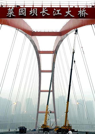 资料图片:2006年12月30日,公路、轻轨两用钢箱提篮拱特大桥――重庆菜园坝长江大桥主跨钢箱拱顺利合龙。