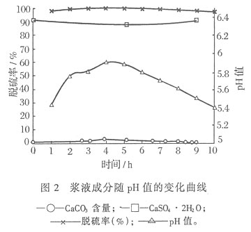 从以上反应历程不难发现,高pH的浆液环境有利于SO2的吸收,而低pH则有助于Ca2+的析出,二者互相对立,因此选择一合适的pH值对烟气脱硫反应至关重要。为此我们做了一次试验,在连续一段时间(10 h)内,人为调整石灰石浆液进吸收塔的流量,使浆液的pH值先从小到大,然后又逐渐减少,图2反映了pH变化时,脱硫率及浆液中CaCO3、CaSO4·2H2O含量的变化曲线。