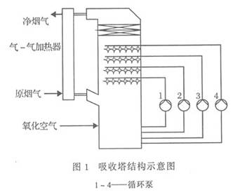 吸收塔由两层搅拌器(上、下各3台)、浆液喷淋盘(4层,交错排列)、两级除雾器组成,在添加新鲜石灰石浆液的情况下,石灰石、石膏和水的混合物通过4台循环泵至喷淋盘,浆液经喷嘴雾化成雾滴,从上部向下喷洒。烟气分别从4、5号炉烟道引出,经增压风机至气-气加热器,烟温从135℃降至100℃左右,然后进入吸收塔下部,在塔内上升过程中与雾滴充分接触,大部分SO2、SO3、HCl等从烟气中去除,反应后的净烟气通过除雾器,以除去夹带的液滴,然后进入气-气加热器被加热后排至烟囱。