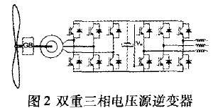 图2给出了这种适用于风力涡轮发电机的全功率变流器的原理图。机侧利用矢量控制策略的三相变流器作为驱动器工作控制转矩发电机。两侧三相变流器则使风能转化的电能进入电网并且能够控制进入电网的无功功率和有功功率大小。它也要保持总谐波畸变因数(THD)尽量低,以改善输送到公共电网中的电能质量。直流链的目的是用作为能量储存,这样由风捕获的能量储存为电容器中的电荷,然后可以即时地注入到电网中。控制信号的作用是为直流链I压Vdc保持一个固定的参考值。
