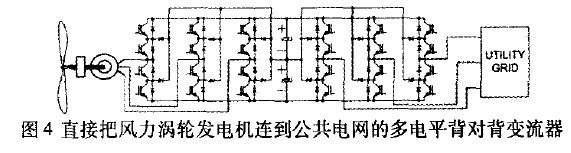 风力涡轮发电机市场的趋势是依据电压和电流额定值,提高其标称功率(几兆瓦)。这使多电平变流器刚好适合这种现代大功率风力涡轮发电机的应用。电压额定值的提高,允许把风力涡轮发电机的变流器直接连接到风电场的配电网络,避免使用笨重的变压器(见图4)。