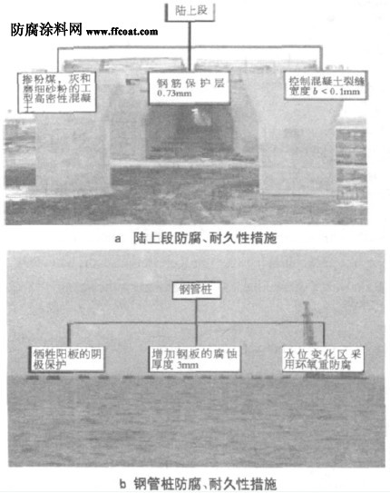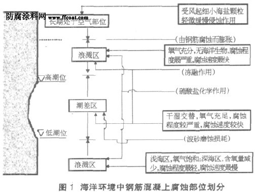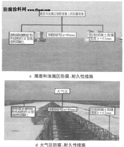 海工混凝土结构的腐蚀破坏是因海水环境中的氯离子渗透聚集于混凝土内钢筋表面并致其钝化膜失去保护作用而造成的,这是一个复杂的电化学腐 蚀过程。为了避免或减少因海水腐蚀作用对混凝土力学性能及耐久性能的影响,就必须采取切实可行的防腐措施。论文在总结国内外混凝土腐蚀现状的基础上,从结 构的腐蚀破坏机理出发,归纳了包括采用结构措施、改善混凝土性能措施、增加混凝土保护层厚度、预留钢结构材料腐蚀厚度、改善施工工艺与提高施工技术水平及 其它特别辅助防腐措施与方法的应用特点及要求。 1 混凝土腐蚀破坏及其腐蚀现状 混凝土腐蚀破坏是指在环境作用下因受物理和化学各种破坏作用而使其耐久性能、力学性能明显降低的现象。它的直接后果则会造成混凝土内部钢筋锈蚀并 产生高达30MPa 的锈胀力,致使混凝土开裂,因而直接影响到结构的安全性和使用性能。据国外 2004 年统计资料介绍,英国现有桥梁中 的 35%~40%因结构腐蚀必须进行修复,所需费用占年 GDT 的 3.14%, 美国近 60 万座桥梁中一半以上出现钢筋腐蚀破坏,每年所需维修 费用占年总建造经费的1.25%。据我国2004年资料统计,国内近40万座桥梁中有1万多座已受到损害,其中4 000多座已成危桥,每年因腐蚀问题造 成的损失达几十亿元。 2跨海桥梁的腐蚀破坏机理 海洋环境下的钢筋混凝土结构不同部位受不同程度侵蚀,侵蚀部位分为长期暴露区、浪溅区、潮差区、水下区 4部位,如图 1 所示。  海洋环境中钢筋混凝土桥梁结构腐蚀的主要原因有:钢筋锈蚀、碳化侵蚀、镁盐、硫酸盐侵蚀、酸性气体侵蚀、碱骨料反应等。其中,钢筋锈蚀是主因,它所造成的破坏和损失最严重。其腐蚀破坏机理如下。 1)碳化作用机理: Ca(OH )2+H2O+CO2→CaCO3+2H2O 碳化结果可使pH < 9,低于保持钢筋钝化最低 pH 值9.5,可导致混凝土中性化,致使钢筋不可避免产生锈蚀。 2)盐类侵蚀作用机理:3CaO·Al2O3+3CaSO4·2H2O+26H2O→3CaO·Al2O3·3CaSO4·32H2O 近年来,由于环境污染严重,在某些地区,酸雨对钢筋混凝土的危害比碳化更为严重。盐类侵蚀引起混凝土体积膨胀、开裂、破坏,发生后很难阻止,不易修补和挽救。 3)钢筋锈蚀作用机理:钢筋锈蚀主要是由氯离子侵蚀引起。调查表明,即使混凝土碳化深度浅,在氯离子含量较高的情况下钢筋也容易遭受腐蚀(见图 2)。  这是由于氯离子的半径小、活性大,穿透力强之故。当钢筋周围混凝土孔隙液中氯离子达到一定浓度时,氯离子吸附在膜结构有缺陷的地方,使难溶的氢氧化铁转变成易溶的FeCl2,致使钢筋表面的钝化膜局部破坏,形成坑蚀现象。钢筋锈蚀过程的主要反应方程式如下:  可以看出, 在钢筋锈蚀过程中氯离子并不改变锈蚀产物的组成,且在混凝土中的含量也不会因腐蚀反应而减少,仅起到催化作用。氯离子导致的钢筋锈蚀 是一个复杂的电化学过程,这个过程可比作电池反应。氯离子一般首先在较小区域的钢筋表面破坏钝化膜, 形成小阳极, 与大部分表面钝化膜完好的钢筋区域即 大阴极间形成腐蚀电偶, 使坑蚀的发展较为迅速,促使钢筋腐蚀、膨胀。并钢筋锈蚀时,理论上铁锈物质体积可达原钢材体积 2 倍~7 倍。在缺氧环境中, 至少也可达钢材体积的1.5倍~3倍。裂缝的扩张和混凝土保护层的开裂和剥离,破坏了钢筋混凝土结构的完整性,也导致钢筋性能减弱。 为保证结构安全使用,确保桥梁在设计基准期内不致于使氯离子渗透至钢筋表面,需采取一系列防腐措施。 3目前采用的主要防腐措施 1) 选择合适的工程布置、结构形式和构造,避免结构形成锈蚀通道。 2) 采用抗腐蚀性和抗渗性良好的优质混凝土、高性能混凝土以改善混凝土工作性能。 3) 根据不同的环境,适当增加的混凝土保护层厚度。 4)预留钢结构材料腐蚀厚度。 5) 采用先进施工工艺,提高施工技术水平。 6)其它特别辅助措施。 3.1 结构措施 合理设计结构形式和构造是防腐的基本措施, 主要归纳如下几点。 1)为减少与海水接触或被浪花飞溅范围,尽量选择大跨度的桥梁布置方案。 2)选择合适的结构形式, 构件截面几何形状应简单、平顺, 尽量减少棱角或突变, 避免应力集中,尽可能减少混凝土表面裂缝。对浪溅区,控制混凝土裂缝宽度小于 0.1mm。 3) 对支座和预应力锚固等可能产生应力集中部位, 采取相应结构措施避免混凝土受拉。 4) 设置检测和维修设施, 便于管理人员监测和修补混凝土裂缝, 考虑构件易于更换的可能性。 3.2改善混凝土性能措施 为了提高混凝土结构的耐久性,应采用优质混凝土。一般是提高普通混凝土密实度和抗渗性及采用高性能混凝土。对普通混凝土,应控制水灰比大小,浪溅区混凝土水灰比最大值可控制在 0.4~0.5 之间。试验研究表明: 1)混凝土的抗裂及抗氯离子侵蚀性能可通过改变胶凝材料中掺合料的比例来实现。 2)大比例单掺粉煤灰或单掺磨细矿渣可显著降低胶凝材料的早期水化热,对后期水化热也有较大的降低作用,采用三组分(含水泥、矿碴、粉煤灰)胶凝材料配制的混凝土,可以配制出绝热温升小并利于改善混凝土的抗裂性能的低热混凝土。 3)在降低水化热方面,中热水泥要优于硅酸盐水泥。利用中热水泥,采用0.30~0.40的水胶比,掺加55%左右的磨细矿渣和15%左右的粉煤 灰,可配制出强度等级满足桥梁混凝土设计规范要求的高性能混凝土,实践证明其具有良好的抗氯离子侵蚀能力